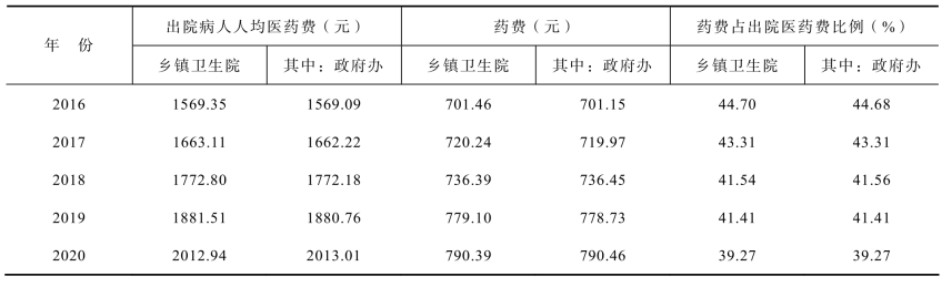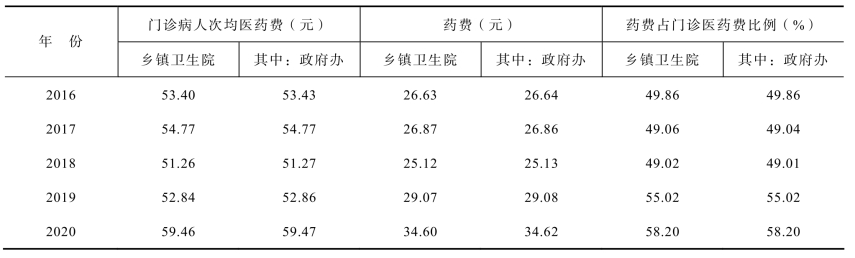 表6-4-5 2016—2020年乡镇卫生院门诊病人次均医药费用