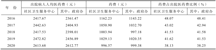 表6-2-6 2016—2020年社区卫生服务中心出院病人人均医药费用