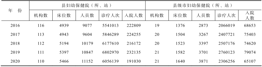 表6-7 2016—2020年县及县级市妇幼保健院(所、站)工作情况
