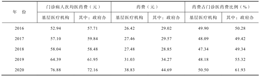 表6-1-4 2016—2020年基层医疗机构门诊病人次均医药费用