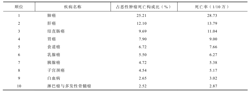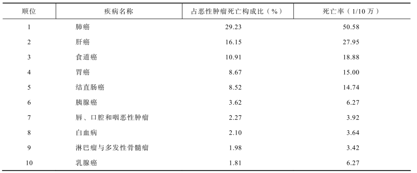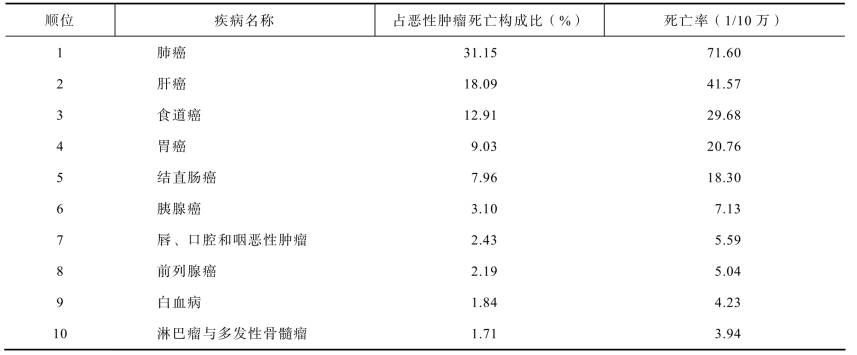 表9-3-1 2020年全省前十位恶性肿瘤死亡率(合计)