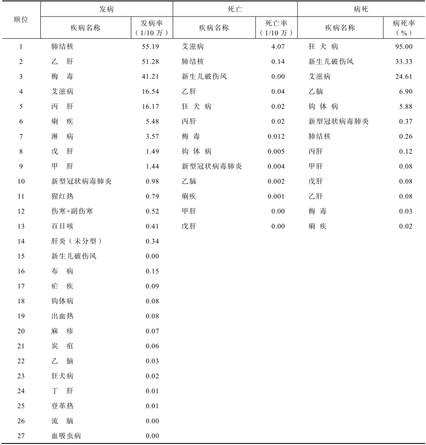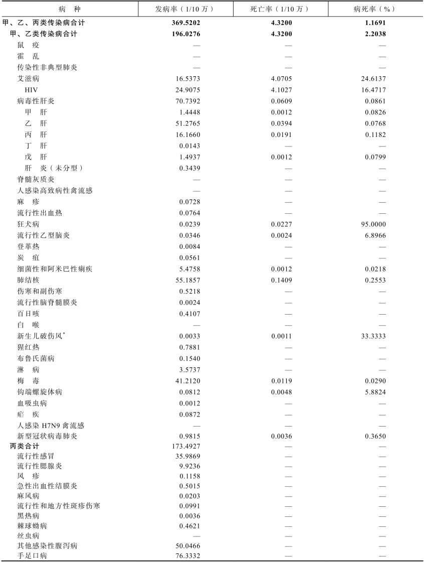 表9-1-1 2020年甲、乙类法定报告传染病发病率、死亡率及病死率及其顺位
