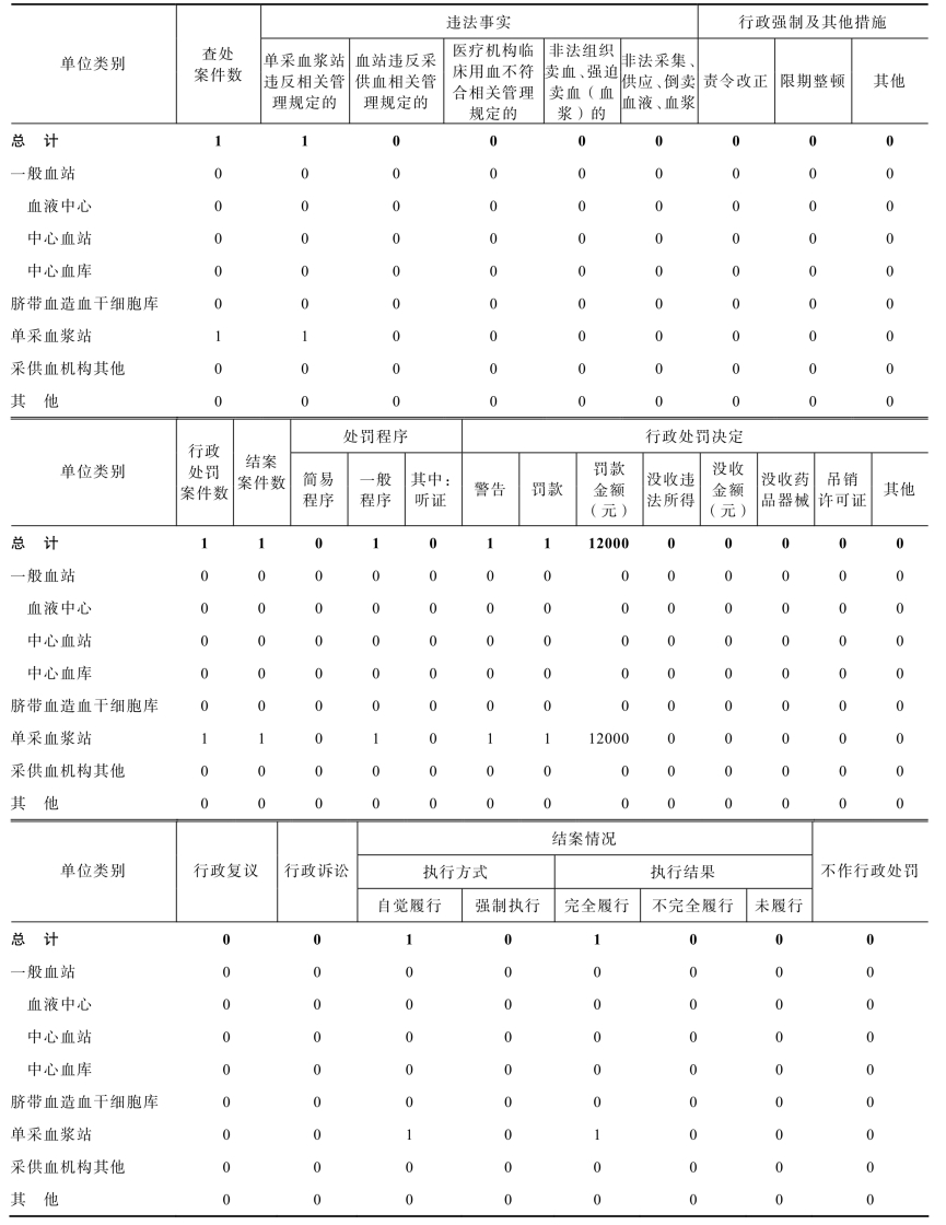 表11-10 2020年全省血液安全卫生监督案件查处情况