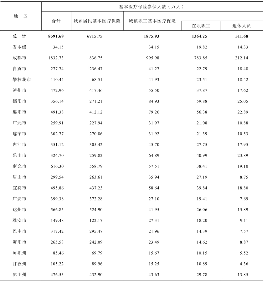 城镇职工基本医疗保险参保人数:指报告期末按国家有关规定参加基本医疗保险的人数,包括参加保险的职工人数和退休人员人数。