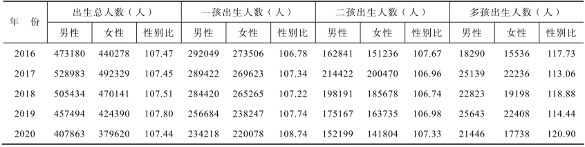 表13-1 2016—2020年全省出生人口数及性别比