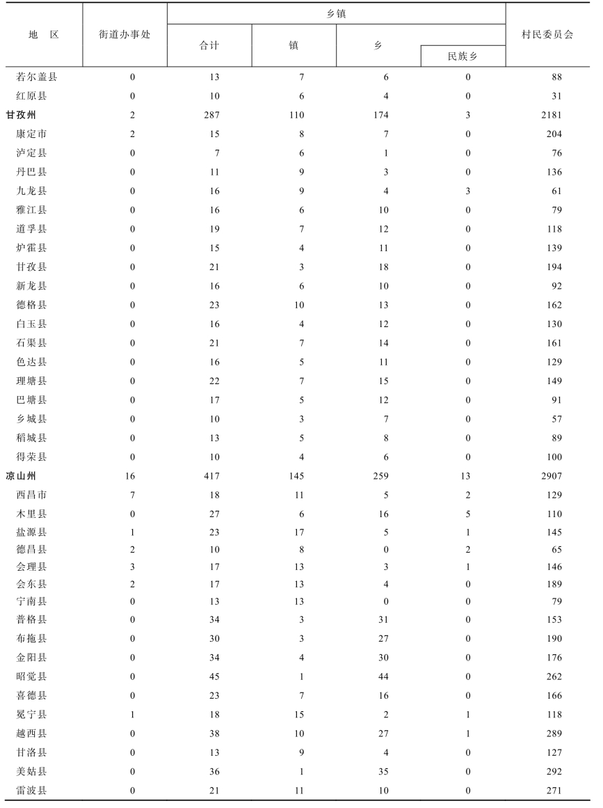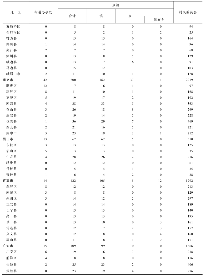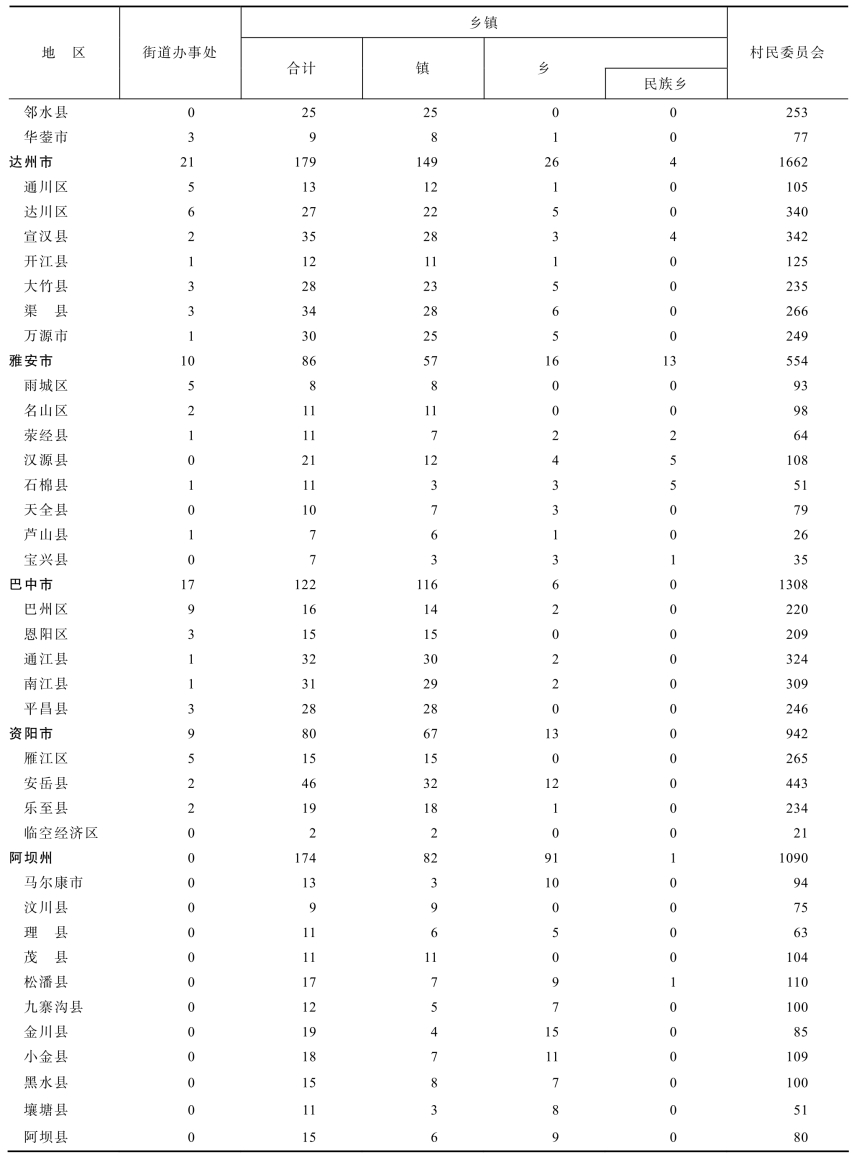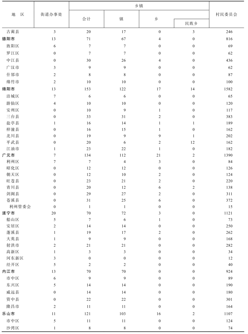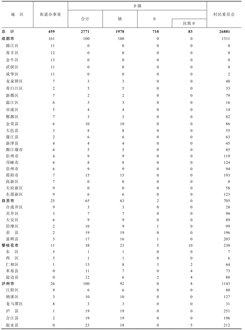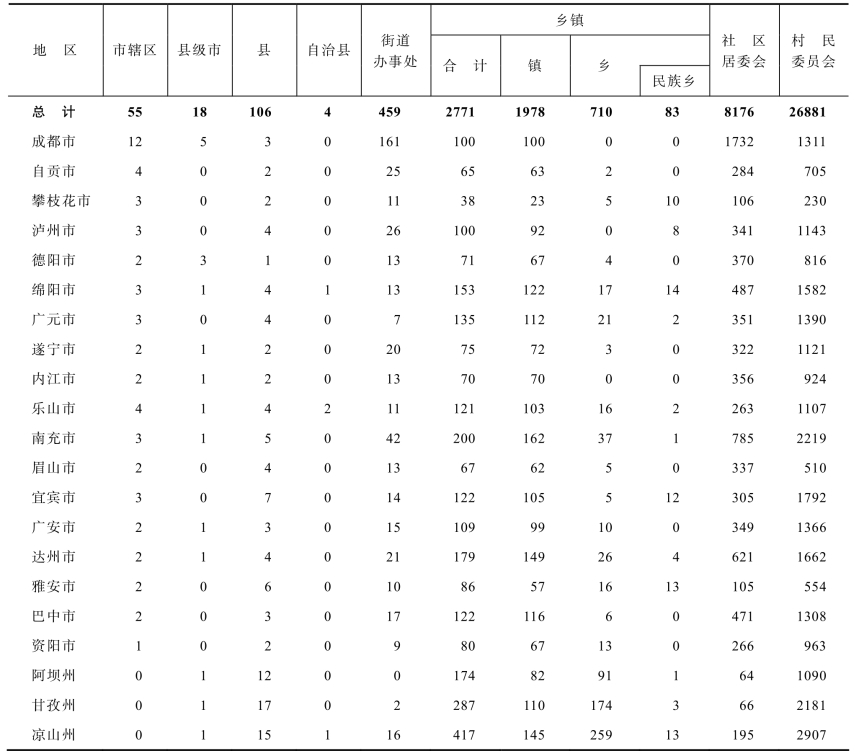 本部分反映全省行政区划数、21 个市(州)及 183个县(市、区)城乡基层组织情况等,数据来源于四川省民政厅数据。
