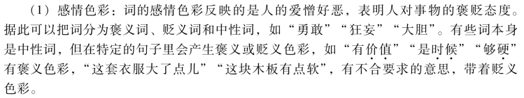 理性义是词义的核心部分,词语还具有色彩义,是附着在理性义之上反映出人们的主观认识,表达出特定感受。色彩义有感情色彩、语体色彩、形象色彩、地域色彩、社区色彩,等等。