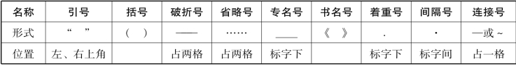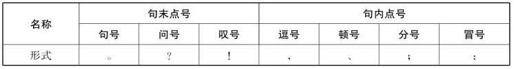 标点符号包括点号和标号两大类。点号表示语句中的各种停顿,句末点号兼表语气。标号用于表示词语或句子的性质和作用,有些也兼有表示停顿的作用。点号有句号、问号、叹号、冒号、分号、逗号和顿号,标号有引号、括号、破折号、省略号、专名号、书名号、着重号、间隔号和连接号,见表2-5、表2-6。