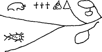 上面就是这个女子在赤杨树的树皮上写给自己情人的信。左上角的熊是女子的图腾,左下角的泥鳅是男子的图腾,曲线代表道路,帐篷表示约会地点,里面有人等着;“+++”代表天主教徒的居住地。