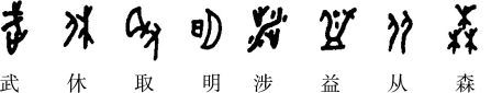 会意字分两类,一类是异体会意字,用不同的字组成。如“武”,止是趾的本字,戈下有脚,表示人拿着武器走,有征伐或显示武力的意思。“涉”的甲骨文像两脚过河。另一类是同体会意字,如“从”,两人一前一后,有随从的意思。
