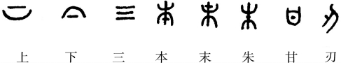 指事字可分两类,一类是象征性符号的指事字,如用三条线表示“三”。另一类是象形字加提示符号,如“本”原义是树根,在“木”下部加一个点,表示树根所在;“末”原义是树梢,在“木”上部加一个点,表示树梢所在;“朱”原义是赤心树,“木”中加一点,表示赤心所在。纯粹用抽象符号的字很少,在象形字上增加符号的方式用得较多。