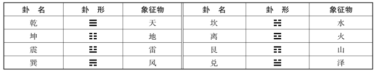 ”符号三叠而成的八种三画卦形,称为“八卦”,它们是《周易》六十四卦的基础。八卦各有一定的卦形、卦名、象征物,其对应关系如下: