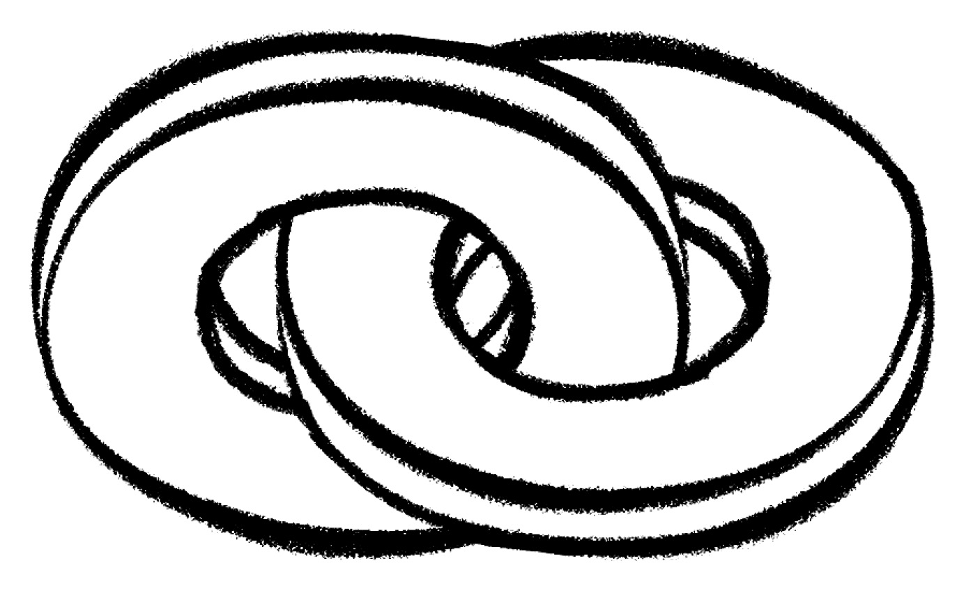“说起来是很简单的方案,你知道,分子有各种各样的形状,有些像个环,有些像条链子,如果将它们丢进水里,就会随机地漂动起来,理论上,不同形状的小家伙们总有一定概率会在水中相遇的,”单簧管先生说,“当链子形状的分子恰好穿过了环状的分子,就可以通过化学反应将链子的两头串起来,这样就能得到两个锁扣在一起的‘双环’了。双环上面的分子就失去了自由。虽然我更乐意叫它‘钥匙圈’,但总得有一个正经名字,我用‘索烃’来称呼它。”