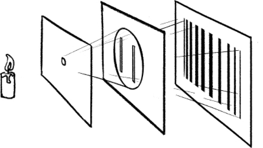 “看吧,人们对光的基本存在不够了解,还经常自信满满。小姑娘,光子可不是原子,它和原子里头的电子、质子才是一个量级的东西。”宇宙鼓点先生说,“说回光子是什么形态。1801年,有个天才终于找到了光子是什么的证据[2]。此人2岁时就学会了阅读,4岁就能将英文佳作与拉丁文诗歌背得滚瓜烂熟。9岁时,他已经开始动手制造一些物理仪器,并且学会了微积分和制作显微镜、望远镜,到了14岁,甚至直接跑去了剑桥大学代课,教的是希腊文。这一年,他28岁了。”