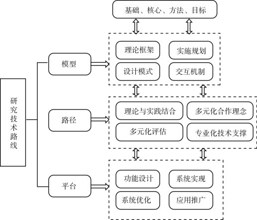 本书的研究思路如图1-1 所示,借助于教育生态学、管理学以及信息科学等相关领域的研究范式,沿着“文献分析、现状调研、顶层设计、模式构建、应用实践、效果分析与模式优化”的基本技术路线进行研究。