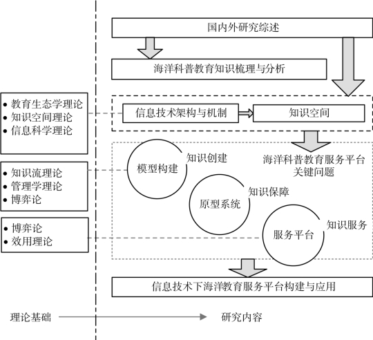 本书的研究技术路线如图1-2 所示,先分析海洋科普教育的基础、核心、方法和目标,依据理论框架、设计模式、交互机制和实施规划,构建海洋教育知识服务模型;通过海洋教育理论与实践结合、多元化合作理念、专业化技术支撑和多元化评估路径,设计系统平台功能模块,利用多维度信息技术手段,构建信息技术下海洋教育服务软件平台。