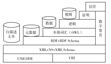 语义Web 技术是能够根据语义进行判断和推理的智能网络,主要核心是通过给万维网上的文档标记成为能够被计算机所理解的语义规则,使整个互联网成为通用的数据交换媒介。语义Web 技术扩展了传统互联网技术的智能应用,让计算机自动理解互联网编码的语义信息,满足互联网知识资源无缝连接和知识智能应用。语义Web 技术体系结构如图2-6所示,它提供系列逻辑结构划分,描述语义Web 技术层次关系,构建自描述文本、元数据、逻辑、规则和数字签名等技术体系,进行互联网知识语义表示和推理,满足互联网知识能被计算机自动分析和理解。