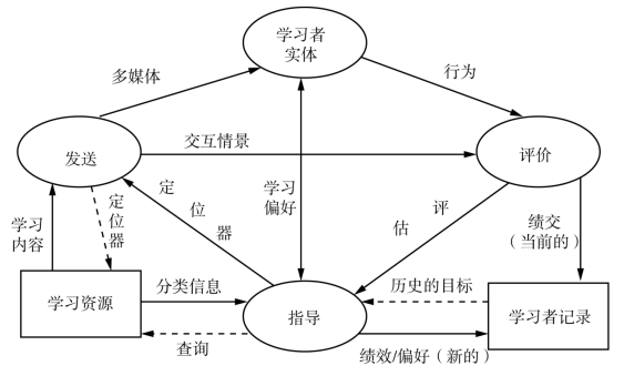 (3)教育流程:根据教育主体学习者学习偏好数据分析学习者的行为,产生评估信息,将当前的绩效存储在学习者纪录中;在分析学习者偏好信息过程中,建立教育查询、信息分类、精准学习情景定位器等模块,将学习内容、多媒体技术、交互情景设计体系化运用。