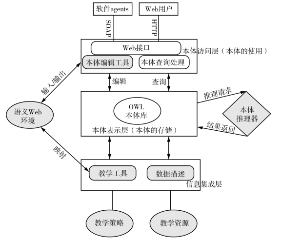 面向语义Web 智能数字化学习系统结构如图2-9 所示,该系统结构由以下功能部分组成:系统Web 用户、本体访问层、教育资源OWL本体库、信息集成层以及语义Web 环境,其中信息集成层又包括教学策略生成的教学工具和教学资源的数据描述。教育资源OWL 本体库包含学习本体和课程本体等本体识破资源,例如,课程本体主要是按照课程内容概念,分层次结构进行课程内容概念分解,并对课程内容间的关系进行描述,以帮助学习者有效自主定位学习知识点。