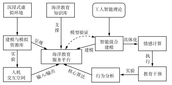 在分析学习者心理和行为特征的基础上,海洋教育服务平台可以利用手环监视器、眼动监测仪等特种设计进行人体电信号采集,结合内外部的多模态设计,对学习者的学习情感信息建模,实现更深层的语义理解和多模态情感交互分析,根据情感状态提供相应的情感干预。在情感计算技术支撑下,海洋教育服务平台建立学习者感觉模型,持续跟踪学习者记录,对样本数据进行质量评估,用数学的符号和计算机的语言,构建教育干预要素的结构方程,接受虚实混合学习检验,进一步验证和优化情感干预动态发展过程,并检验其有效性,提高学习者能力。