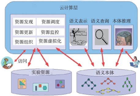 在云计算服务形式的基础上,结合语义本体技术,构建基于语义云海洋教育资源模块。基于语义云海洋教育资源模块框架结构如图2-11所示,由海洋教育资源(以实验资源形式)、云计算层和语义本体三大层次组成。海洋教育层包括资源发现、资源调试、资源更新、资源监控、资源组织和资源虚拟化功能模块等,以满足学习者自适应性知识服务需求,同时,平台提供资源访问接口,通过云连接网络为学习者提供一个友好的交互界面,可实现学习者对海洋教育资源库的访问以及资源个性化需求。