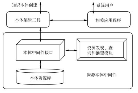 海洋教育知识推理模块基于本体理论知识表达,通过语义本体技术来表达海洋领域知识,建立语义知识规则相关定义,开发完整的基于语义云海洋教育资源模块框架的规则库,采用知识平台作为系统的推理引擎,构建相应的海洋教育知识推理系统,完成海洋教育知识推理预测要求,同时,以多种实验验证海洋教育知识推理系统的正确性,设计提供集成、互操作以及知识维护和重用等功能本体中间件,如图2-12 所示,为海洋教育知识推理提供灵活性和扩展性资源本体中间件。