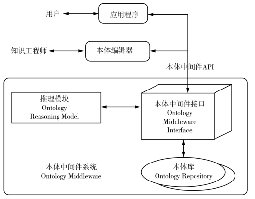 海洋知识本体中间件系统结构如图2-21 所示,海洋知识本体中间件系统的使用者分为两类:普通用户和知识工程师。普通用户并不直接与本体中间件交互,而是通过应用程序调用本体中间件系统的API 访问系统功能。知识工程师使用本体编辑器实现对本体的编辑处理,并通过本体中间件API 将结果存入本体库中。本体中间件接口负责处理来自用户和知识工程师的服务请求。本体中间件接口通过调用推理模块提供的服务完成相关的推理任务。海洋知识本体中间件“推理器”通过OWL 本体具体描述逻辑系统来实现。