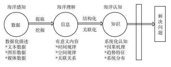 海洋科普教育知识服务框架如图3-1 所示,构建海洋数据、海洋信息和海洋知识三大模块,通过对数据化描述的海洋数据进行提取、挖掘,凝练出具有时间规律、空间规律、关联关系和有意义的海洋信息,并对海洋信息进行结构化和关联化处理,创建具有因果机理、趋势特征和系统化认识的海洋知识,为用户提供海洋感知、海洋理解和海洋认识等知识服务。海洋科普教育知识服务的目标是帮助用户解决海洋科普教育相关问题,其性质就是海洋科普教育信息服务过程,最主要的特点是提供面向海洋科普教育的知识资源和解决问题的服务。