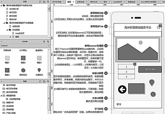 可视化海洋教育服务平台原型图设计如图4-24 所示,根据平台需求设计功能和界面,用软件元件行为功能制作交互效果,用中继器模拟数据库行为,可视化创建海洋科普教育应用软件的原型。海洋教育服务平台的模块、元素、人机交互的形式,利用线框描述的方法,在可视化状态下将应用软件更加具体和生动地表达和演示出来。