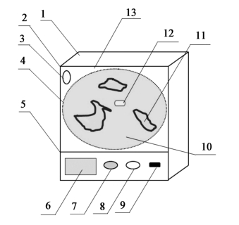 1—工作箱;2—岛屿科普游戏区模块;3—指南针;4—边界线;5—游戏控制模块;6—显示模块;7—语音控制模块;8—语音输出模块;9—存储模块;10—海洋背景图;11—海岛;12—磁块;13—岛屿地图游戏模块