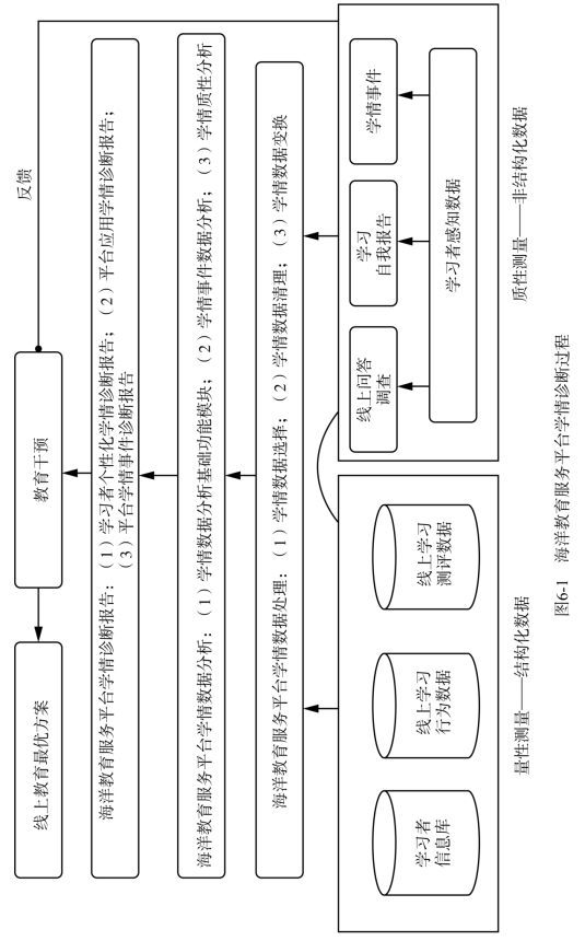 在数字化教育研究领域中,大数据得到了广泛的应用。海洋教育服务平台可以结合学习行为分析方法和教育大数据挖掘技术进行精准化学情诊断。精准化学情诊断过程运用学习监测和分析技术,全面地采集教学活动过程中直接产生的数据,如在线学习、考试和测评等,通过对水平测试评估、学习者反馈意见等数据进行记录、整理、分析,从冗杂的数据中发现相关联系,结合最近发展区等教育理论,对学习者基本信息、学习偏好、学习目标等建模分析,建立多维度数理统计模型,自动生成学情诊断报告,精准分析学情并实施教育干预。海洋教育服务平台学情诊断具体过程如图6-1 所示,首先海洋教育服务平台对线上学习行为数据、线上学习测评数据和学习者感知调查数据等学情数据进行采集,然后进行学情数据选择、学情数据清理和学情数据变换等数据处理,接着开展学情基础数据分析、学情事件数据分析和学情质性分析等,在学情数据分析基础上,形成海洋教育服务平台学习者个性化学情诊断、平台应用和平台学情事件等学情诊断报告,海洋教育服务平台依据学情诊断报告进行教育干预。根据反馈意见,海洋教育服务平台又可以重新执行一次学情诊断循环,在不断的循环中调整和优化,最后形成线上教育最优方案。