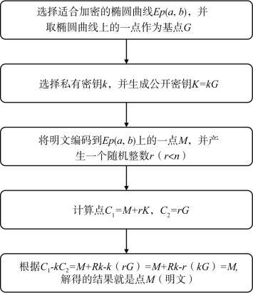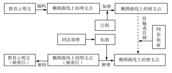 海洋教育服务平台加密系统基于计算复杂性数学难题理论的密码学技术,利用同态加密和椭圆曲线两种算法,对用户数据进行加密处理。加密系统算法允许在没有解密算法和解密密钥的条件下对加密的用户数据进行运算。加密系统对用户数据中的明文信息经过分组和编码操作,将编码信息嵌入到复杂椭圆曲线上,使编码信息成为椭圆曲线有限群中的某个不固定的点,从而实现同态加密和椭圆曲线的数据混合加密[4]。海洋教育服务平台加密系统选择合理的密钥长,为平台提供的安全系数比较高。