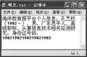 以“云端教育”用户个人隐私数据保护为例,海洋教育服务平台利用加密系统对用户个人隐私数据进行加密。用户个人隐私数据的明文如图6-13 所示,通过服务平台利用加密系统处理后,生成用户个人隐私数据的密文如图6-14 所示。用户个人隐私数据的密文呈现乱码状态,导致无法正常识别,从而防范数据信息泄露。海洋教育服务平台加密系统能快速生成符合条件的密钥,具有良好的数据加密效果,满足用户数据高安全性的要求。
