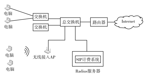 异构网络身份认证系统网络拓扑结构如图6-17 所示,实验仿真平台创建的客户端包含有线接入电脑及无线接入AP;交换机由接入层交换机和汇聚层交换机组成,边界路由器布置在互联网出口上,Radius 服务器是用来对网络用户进行访问控制的认证服务器。