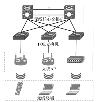 无线网络自上而下划分为核心层和接入层两大主体部分。核心层由两台无线核心交换机组成,通过链路与有线核心交换机链接,实现有线网络区域与无线网络区域的互联互通。两台无线核心交换机经过链路聚合形成全冗余的无线网络核心,保证无线网络的数据高速交换和路由快速收敛。无线网络的接入层部署多台PoE 交换机(Power over Ethernet,以太网供电),每台PoE 交换机与无线核心层交换机建立连接,通过链路下连到无线AP(Wireless Access Poin,无线接入点),提供骨干链路的备份,保证无线网络的稳定连接。