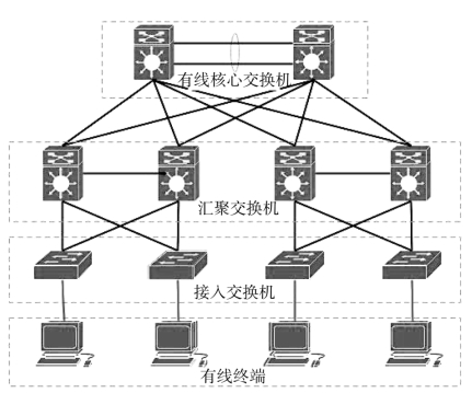 有线网络是平台网络业务的承载主体,具有系统结构复杂、使用规模庞大和运行负荷水平高的特点,这些特点又易于转化为平台网络可靠稳定运行的不利因素。有线网络冗余架构设计图如图6-19 所示,平台网络利用网络架构层次化方法,把有线网络规划成有线终端、接入交换机、汇聚交换机和有线核心交换机等结构层次,合理化网络结构和简化网络管理复杂度。层次化的网络架构具有以下优点:当网络故障发生时,管理者只需到相应的故障层查找并解决问题,有目的地将故障限定在特定管理层区域,达到隔离故障的效果,提高平台网络容错效率。
