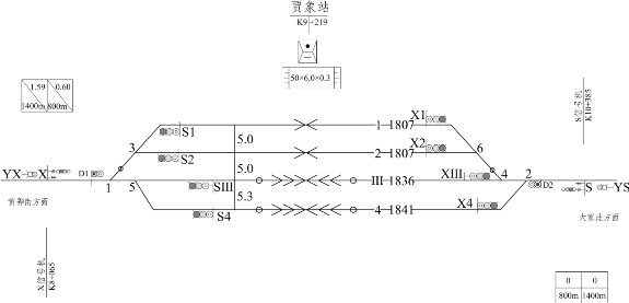 站房设于正线左侧,设到发线4条(含正线1节),预留1条,到发线有效长均大于 1 800 m;在行车室西侧设基本站台 1 座(50 m×6 m×0.3 m)。