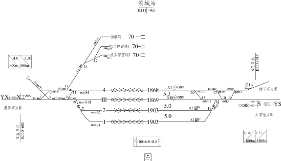 站房设于正线右侧,设到发线4条(含正线),预留3条,到发线有效长均大于 1 800 m;在行车室北侧设基本站台 1 座(100 m×6 m×0.3 m);车站设有机车停留线 2 条,有效长均为 150 m;接触网工区一处,线路有效长120 m;机待线1条,有效长80 m。