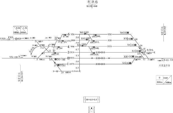 站房位于正线右侧,设到发线3条(含正线)为1、Ⅱ、3道;左侧设东营港疏港铁路交接场,交接场设到发线3条为4、Ⅴ、6道,到发线有效长均大于1 800 m,其中3、4、Ⅴ、6道设有腰岔,A、B端有效长均大于 900 m,可进行万吨组合作业。利津站与东营港疏港铁路利津西站接轨,东营港疏港铁路线无法接发万吨列车,需在利津站分解后运往东营港疏港铁路。