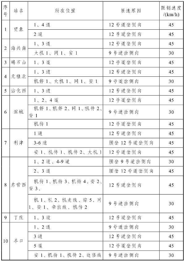 (2)除羊口站1、2道为9号道岔侧向道岔限速30 km/h外,其余各站侧向道岔均采用12号道岔限速45 km/h。