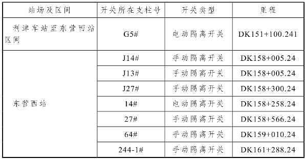 表2-19 东营西站接触网分相、分段绝缘器位置