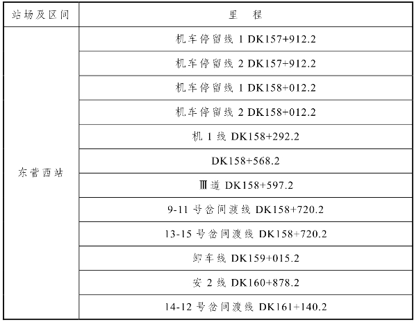 (5)接触网终点标:东营西站 DK157+120.2、DK157+810、DK158+600、DK158+790、DK161+250、DK161+345。
