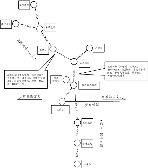 滨港铁路全长 110 km,分为滨港铁路一期和滨港铁路二期。滨港铁路一期(小营至沾化段)自国铁小营站接轨,途经博兴县、高新技术开发区,滨城区,沾化区,线路全长 45 km(小营至滨州段 19 km,滨州至沾化段 26 km),共设 4 个站,即小营站、滨州北站、泊头镇站、沾化站,于2004年开工建设,2009年建成通车,委托中国铁路济南局集团有限公司代管运营。