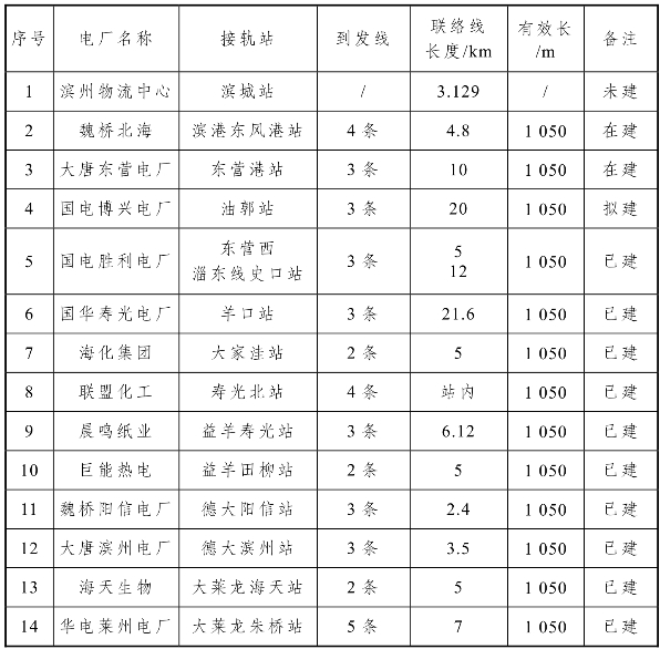 黄大线可通过接轨铁路联络线、企业专用线连接三个电厂、一个物流园,共辐射14个企业。如表3-1所示。