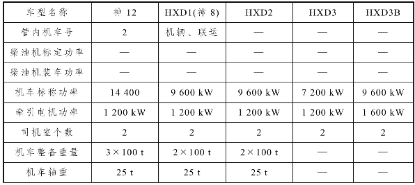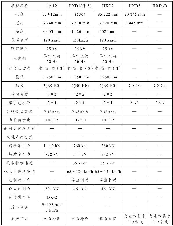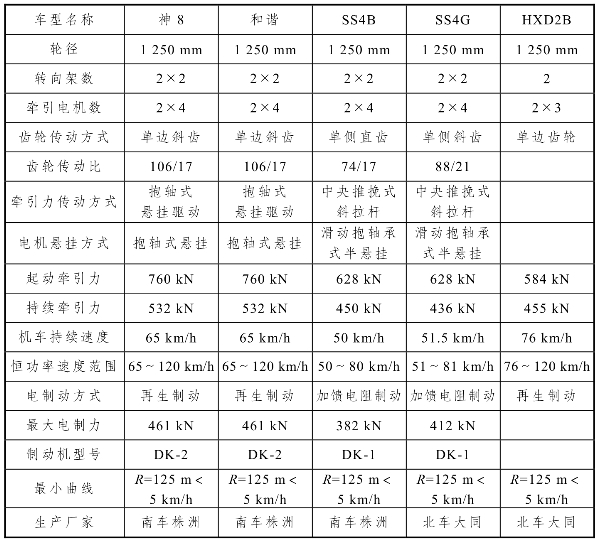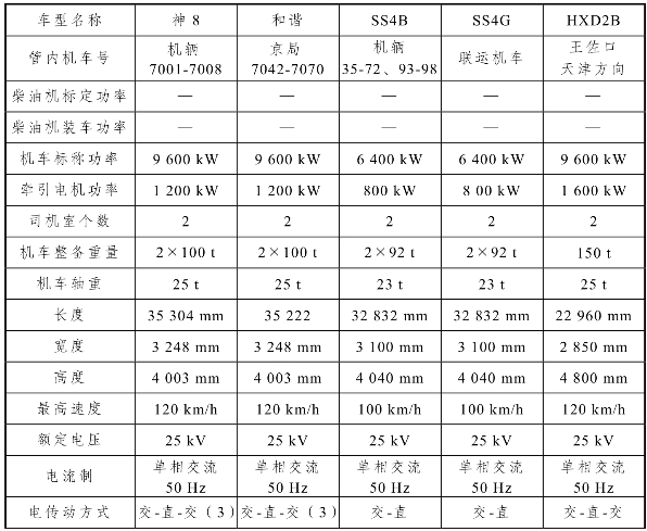 SS4(SS4B、SS4G)型、神华号 8 轴(HXD1)型、神华号 12 轴(CEAIA1)型、和谐号(HXD1)型。详见电力机车参数表4-1、4-2。