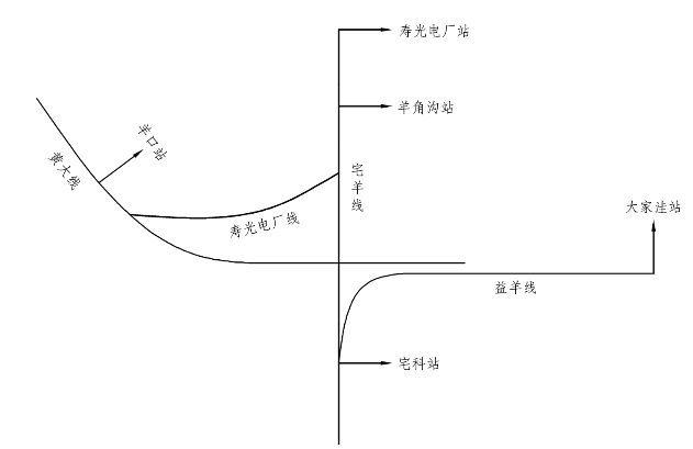 寿光电厂方向列车以开行C80型万吨列车为主,万吨列车在利津站或东营西站分解,到达东营西站后,摘下列尾,直流机车担当本务时,乘务员换班;交流机车担当本务时,换挂东营西站调车机,运行至羊口站,办理货运交接手续后换挂益羊铁路管理处机车牵引至国华寿光电厂;电厂卸空列车由益羊铁路管理处机车挂运至羊口站,货运交接完毕,换挂黄大铁路机车运行至东营西站后本务机车摘车入库,车列进行技检作业后机车出库挂车在东营西站或利津站组合万吨列车发车,如图 4-5所示。