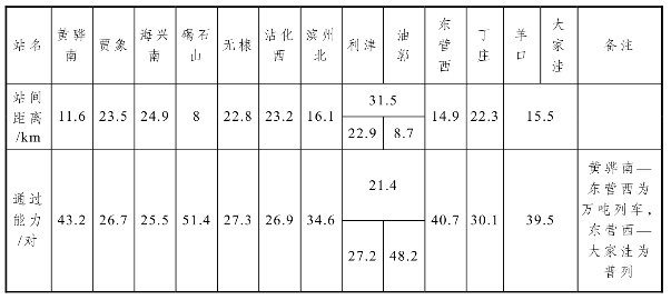 经初算黄大铁路区间最大能力为碣石山至无棣区间,区间通过能力51.4对;万吨限制区间为利津至东营西站间,区间通过能力21.4对;普列限制区间为丁庄至羊口站间,区间通过能力30.2对,运输能力4 400万吨。