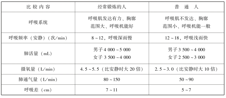 表2-2 经常锻炼的人与普通人的呼吸机能对比