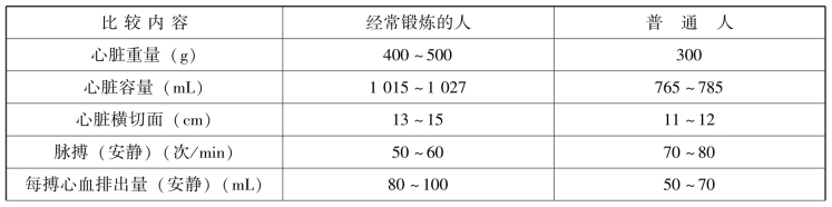 经常锻炼能使心脏的重量增加,容积增大,心肌增厚,心脏变得更有力;心搏徐缓,心缩有力,每搏心血排出量增加,血管弹性增加,血流量加速加大;经常锻炼还可预防高血压、高血脂、动脉硬化和冠心病等。经常锻炼的人与普通人的心脏对比见表2-1。