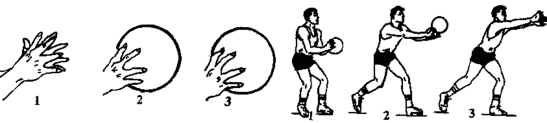 (1)双手持球:两手手指分开,拇指相对成“八”字形,手心空出,两臂屈肘,肘关节下垂,球置于胸前。